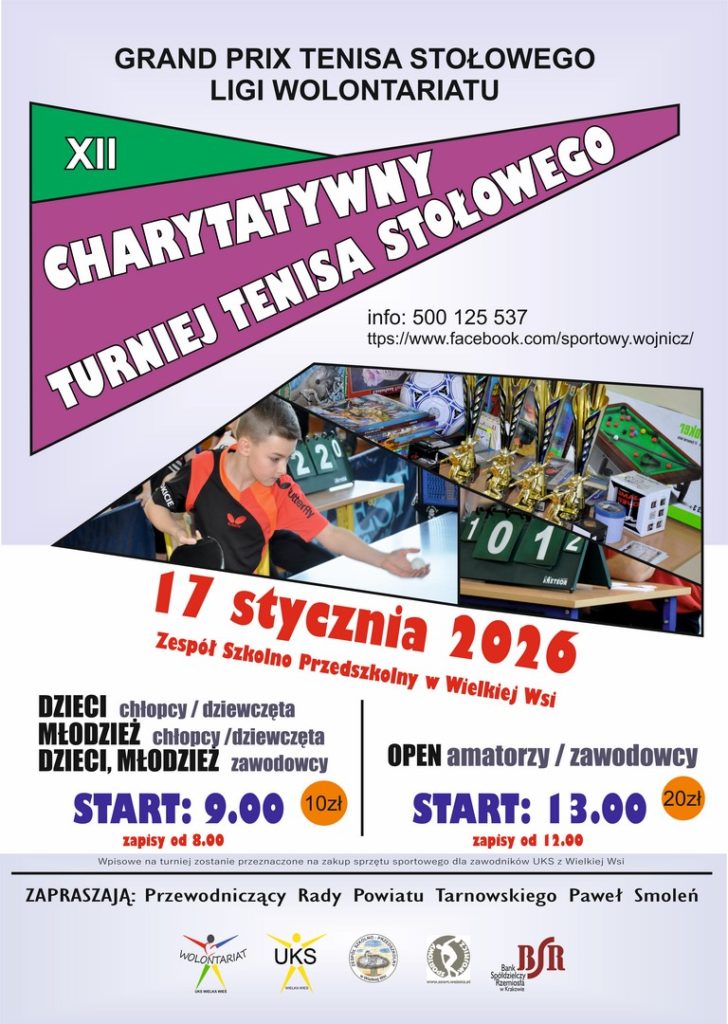 🎉🏓 Serdecznie zapraszamy na XII Charytatywny Turniej Tenisa Stołowego – Grand Prix Tenisa Stołowego Ligi Wolontariatu 🏓🎉, który odbędzie się 17 stycznia 2026 roku 📅 w sali sportowej Zespołu Szkolno-Przedszkolnego w Wielkiej Wsi (32-830 Wojnicz) 📍. Start turnieju zaplanowany jest na godzinę 9:00 ⏰. Wydarzenie skierowane jest do dzieci, młodzieży oraz dorosłych 👧🧒🧑🎓 – zarówno amatorów, jak i zawodników 💪 – i stanowi doskonałą okazję do sportowej rywalizacji w przyjaznej, pełnej pozytywnej energii atmosferze 🤝😊. Turniej łączy pasję do tenisa stołowego z ideą pomocy innym ❤️, ponieważ całość wpisowego zostanie przeznaczona na zakup sprzętu sportowego dla zawodników UKS z Wielkiej Wsi 🏓🎽. Uczestnicy rywalizować będą w kategoriach dzieci i młodzieży (chłopcy i dziewczęta) 👦👧 oraz w kategorii OPEN 🧑🤝🧑. Wpisowe wynosi 10 zł 💰 dla dzieci i młodzieży oraz 20 zł 💰 w kategorii OPEN. Zapisy prowadzone będą w dniu turnieju – od godziny 8:00 📝 dla dzieci i młodzieży oraz od 12:00 📝 dla kategorii OPEN. Gwarantujemy emocjonujące mecze 🔥, wysoki poziom sportowy 🏆, nagrody 🎁 oraz świetną atmosferę sprzyjającą integracji i dobrej zabawie 🎶😄. Do udziału zapraszamy nie tylko zawodników, ale również kibiców i wszystkich sympatyków sportu 👏, którzy chcą aktywnie spędzić czas i wesprzeć szczytny cel 💙. Szczegółowe informacje można uzyskać pod numerem telefonu 500 125 537 📞. Do udziału w wydarzeniu zaprasza Przewodniczący Rady Powiatu Tarnowskiego Paweł Smoleń 🤝. Nie zwlekaj – dołącz do nas i zostań częścią wydarzenia, które łączy sport, pasję i pomoc innym 🙌🏓. Do zobaczenia przy stołach! 🎉💪
